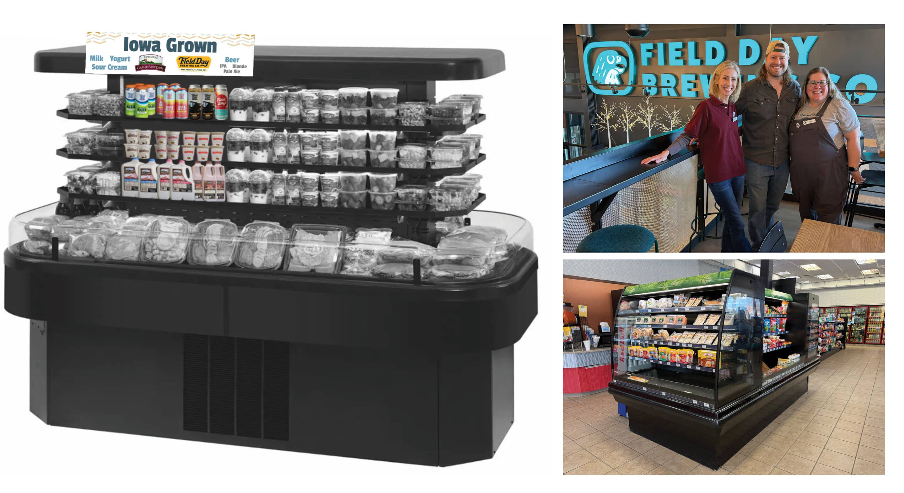[Pictured clockwise from left: Mock up of new open-air cooler featuring an Iowa Grown section; CEO Tiffany Fraley with Alec Travis, Co-Owner Beverage Director of Field Day Brewing, and Lindsay Griffith of InConvenience Inc;  Current open-air cooler at The Gas Spot in Davenport, IA]